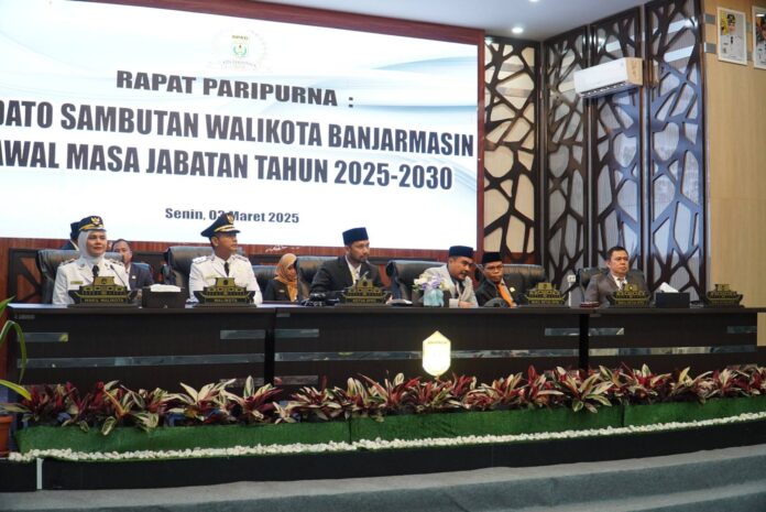 klikkalimantan.com, BANJARMASIN – DPRD Kota Banjarmasin menggelar Rapar Paripurna dengan agenda Pidato Sambutan Walikota Awal Masa Jabatan 2025-2030 di Gedung Dewan, Senin (3/3/2025).