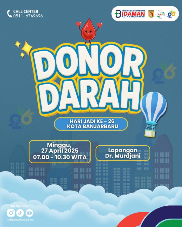 klikkalimantan.com, BANJARBARU – Dalam rangkaian peringatan Hari Jadi ke-26 Kota Banjarbaru, RSD Idaman Banjarbaru akan melaksanakan donor danar. Kegiatan donor darah menurut Direktur RSD Idaman, dr Danny Indrawardhana, akan digelar Minggu, 27 April 2025 di Lapangan dr Murdjani.
