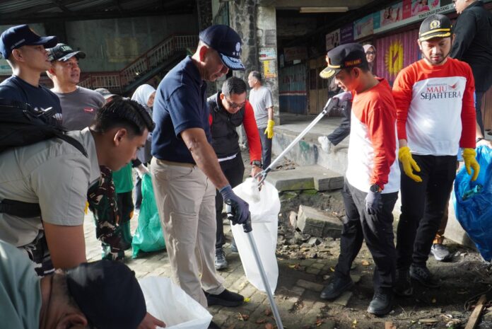 Ketua DPRD Kota Banjarmasin Rikval Fahruri bersama Walikota dan Perwakilan KemnLH RU mengikuti bersih-bersih di kawasan Pasar Antasari, Senin (9/3/2026)