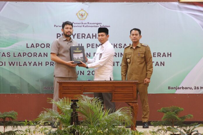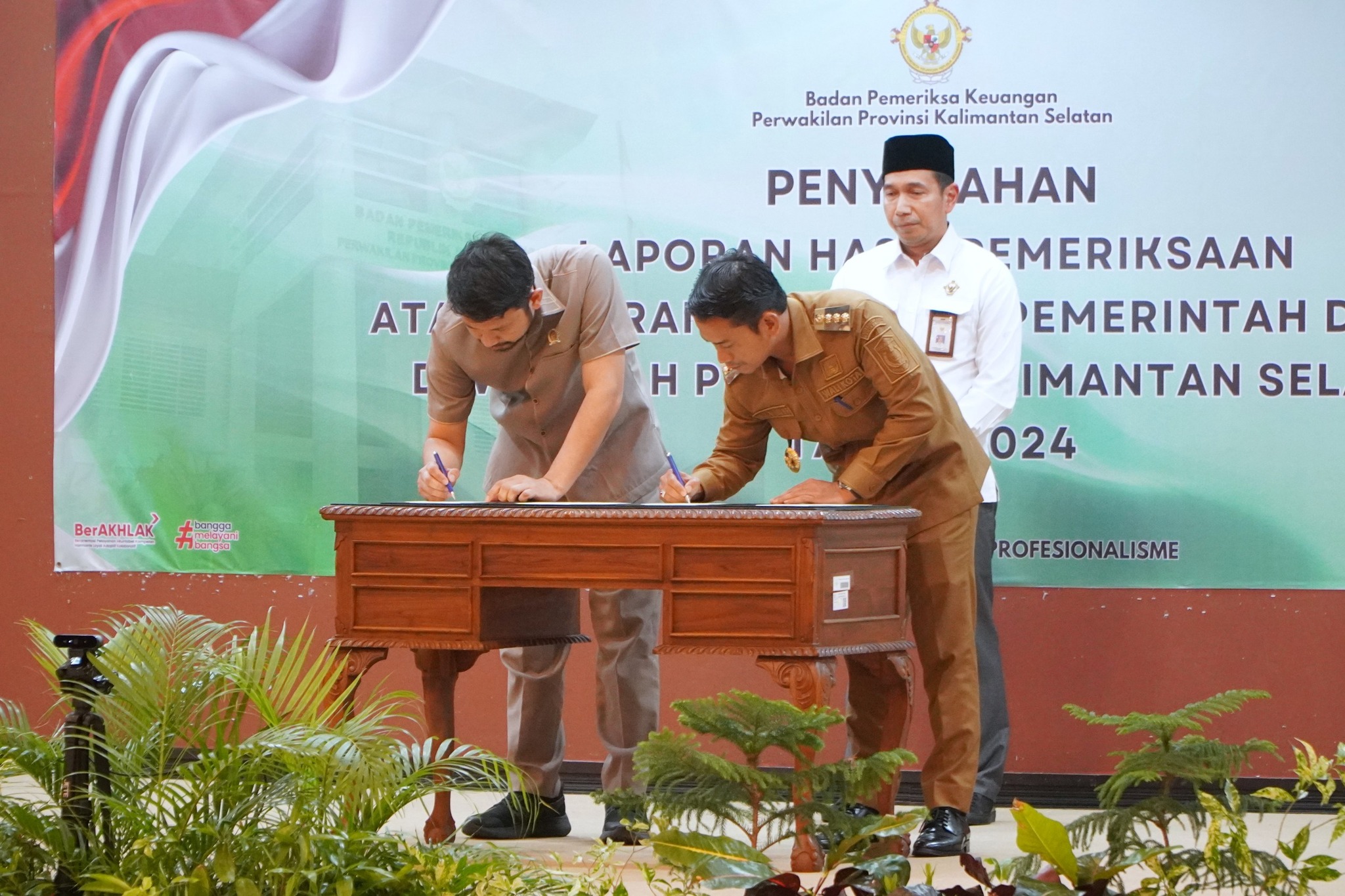 Ketua DPRD Kota Banjarmasin, Rikval Fachruri bersama Walikota H Muhammad Yamin HR menerima Laporan Hasil Pemeriksaan (LHP) atas Laporan Keuangan Pemerintah Daerah (LKPD) Wilayah Provinsi Kalimantan Selatan Tahun 2024 dari Badan Pemeriksa Keuangan (BPK) Perwakilan Kalimantan Selatan.