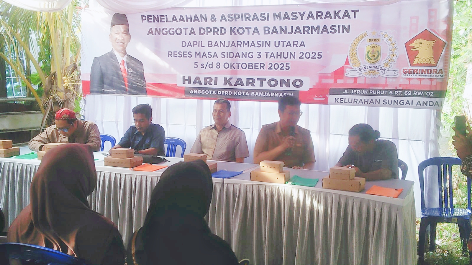 klikkalimantan.com, BANJARMASIN – Dalam rangka menjaring aspirasi masyarakat sekaligus mempererat komunikasi antara wakil rakyat dan konstituen, Anggota DPRD Kota Banjarmasin Hari Kartono menggelar kegiatan reses di Komplek Jeruk Purut 6 RT 69, Kelurahan Sungai Andai, Kecamatan Banjarmasin Utara, Selasa (7/10/2025).