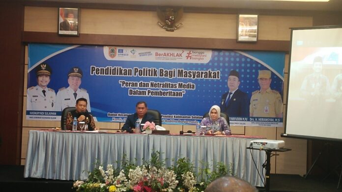 klikkalimantan.com, BANJARMASIN — Badan Kesatuan Bangsa dan Politik (Kesbangpol) bekerja sama dengan Persatuan Wartawan Indonesia (PWI) Kalimantan Selatan, menggelar kegiatan Pendidikan Politik bagi Masyarakat dengan tema “Peran dan Netralitas Media dalam Pemberitaan”, bertempat di Hotel Roditha Banjarmasin.