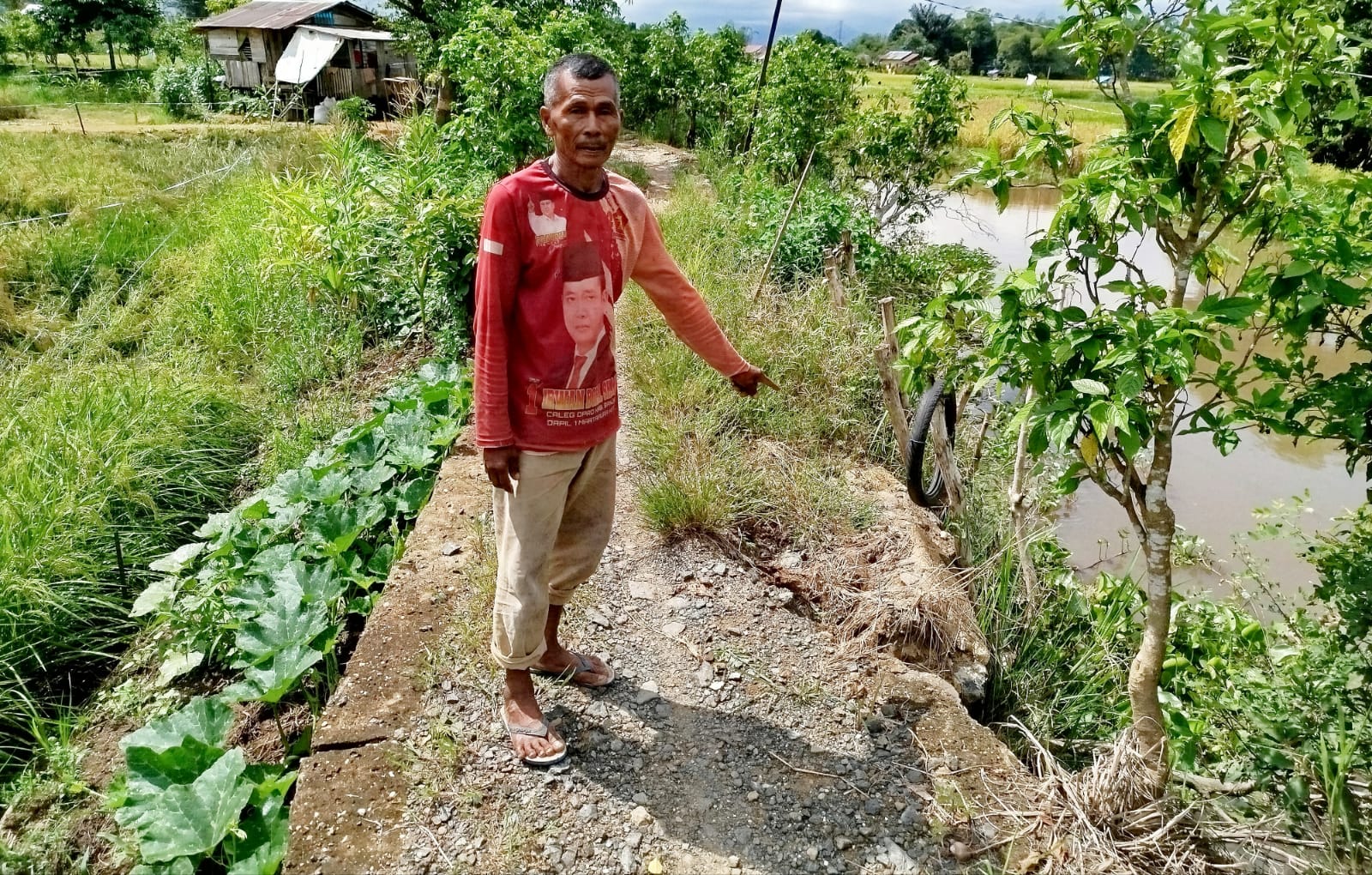 “Karena kondisi jalan dan jembatan seperti ini, kalau tidak salah sudah dua kali kejadian warga yang mengendarai motor roda duanya terjungkal saat mau menuju ladang mereka. Beruntung tidak jatuh ke sungai, karena di samping jalan inikan sungai dan sangat membahayakan,” ujarnya pada 2 September kemarin.