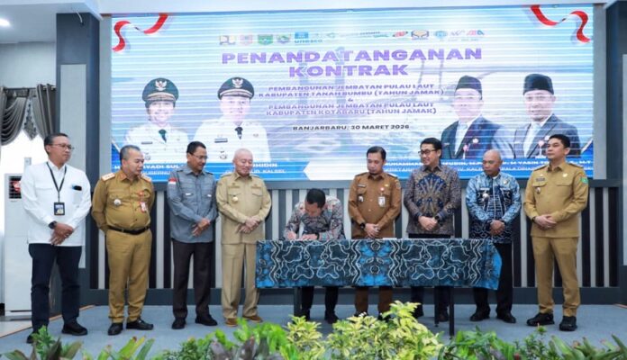 klikkalimantan.com, BANJARBARU – Pembangunan Jembatan Pulat Laut -pengubung Kabupaten Tanah Bumbu dan Kotabaru- dimulai. Disaksikan Gubernur Kalimantan Selatan (Kalsel), H Muhidin, penandatanganan kontrak antara Kepala Dinas Pekerjaan Umum dan Penataan Ruang (PUPR) Kalimantan Selatan, M Yasin Toyib dengan pihak Kuasa Kerjasama Operasi (KSO), Senin (30/3/2026) menandai dimulainya proyek tersebut.