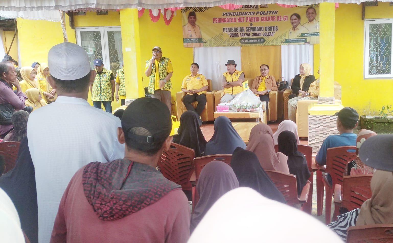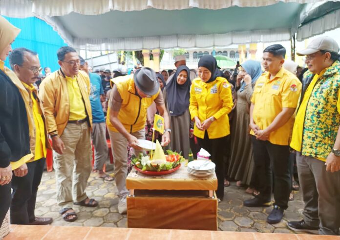 “Kalau dahulu untuk memeriahkan HUT Partai Golkar kita melaksanakan kegiatan jalan santai dan lain sebagainya. Pada HUT ke-61 polanya kita ubah dengan membagikan paket sembako kepada masyarakat sekitar tak terkecuali perwakilan di tingkat kecamatan agar lebih menyentuh,” tutur H Rusli yang berharap Partai Golkar tetap unggul dimata masyarakat.