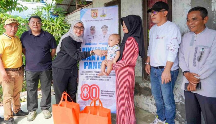 Disalurkan serentak, Jumat (8/8/2025), penyerahan simbolis bantuan bahan pangan dilakukan Wali Kota Banjarbaru, Hj Erna Lisa Halaby di Kelurahan Landasan Ulin Tengah, Kecamatan Liang Anggang. Ini sekaligus realisasi salah satu program 100 kerja Lisa Halaby bersama wakilnya, Wartono.