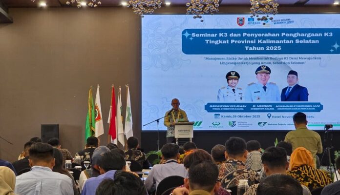 klikkalimantan.com, BANJARBARU – Gubernur Kalimantan Selatan (Kalsel), H Muhidin diwakili Staf Ahli Bidang Pemerintahan Hukum dan Politik, Adi Santoso menghadiri Seminar Keselamatan dan Kesehatan Kerja (K3), Kamis (9/10/2025) di Ballroom Hotel Novotel Banjarbaru. Pada saat yang sama, juga dilakukan enyerahan Penghargaan K3 Tingkat Provinsi Kalsel Tahun 2025.