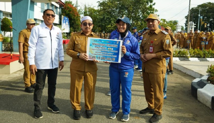 klikkalimantan.com, MARTAPURA – Wakil bupati (Wabup) Banjar, Habib Idrus Al habsyi menyerahkan bonus kepada para pegiat olahraga berprestasi di ajang Festival Olahraga Tradisional Daerah (FORDA) VII Kalimantan Selatan (Kalsel) 2025. Penyerahan dilakukan usai pelaksanaan apel kerja gabungan lingkup Pemerintah Kabupaten (Pemkab) Banjar, Senin (6/4/2026) di pelataran depan Kantor Bupati Banjar di Martapura.