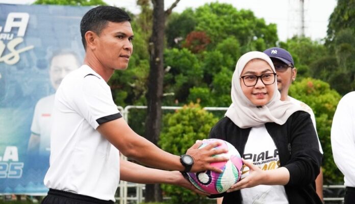 klikkalimantan.com, BANJARBARU – Wali Kota Banjarbaru, Hj Erna Lisa Halaby menghadiri pembukaan tunamen ‘Gila Bola Tutup Tahun Piala Banjarbaru Emas 2025’, Rabu (3/12/2025) di Lapangan Murdjani Banjarbaru. Penyerahan bola kepada wasit menandai dimulainya turnamen antar kelurahan kategori Usia 40 (U-40), 3 – 20 Desember tersebut.