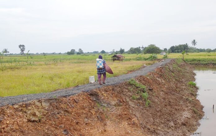 “Jalan inikan pintu masuknya, kalau hanya selebar 1 meter kendaraan roda dua saja berpapasan sulit. Ditambah gundukan tanah tidak dirapikan, karena itu kami bergotongroyong merapikannya agar dapat dilalui, terlebih mendekati masa panen,” keluhnya.